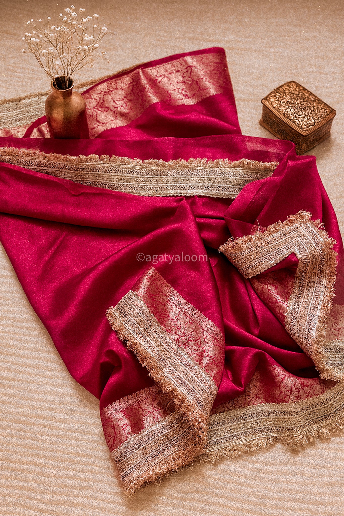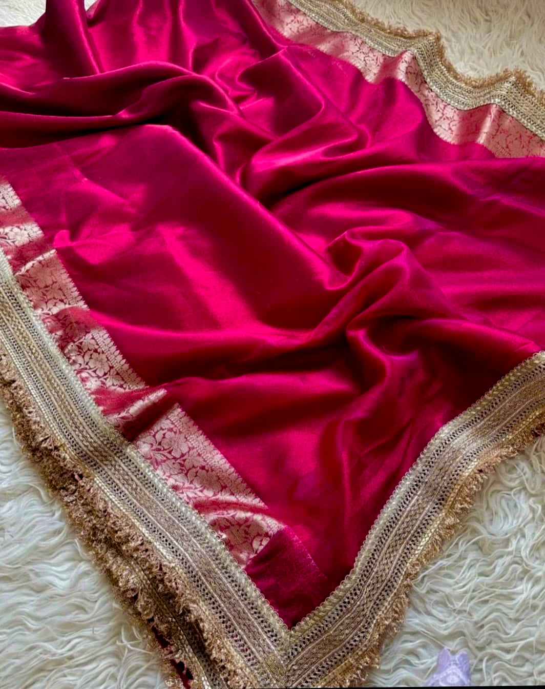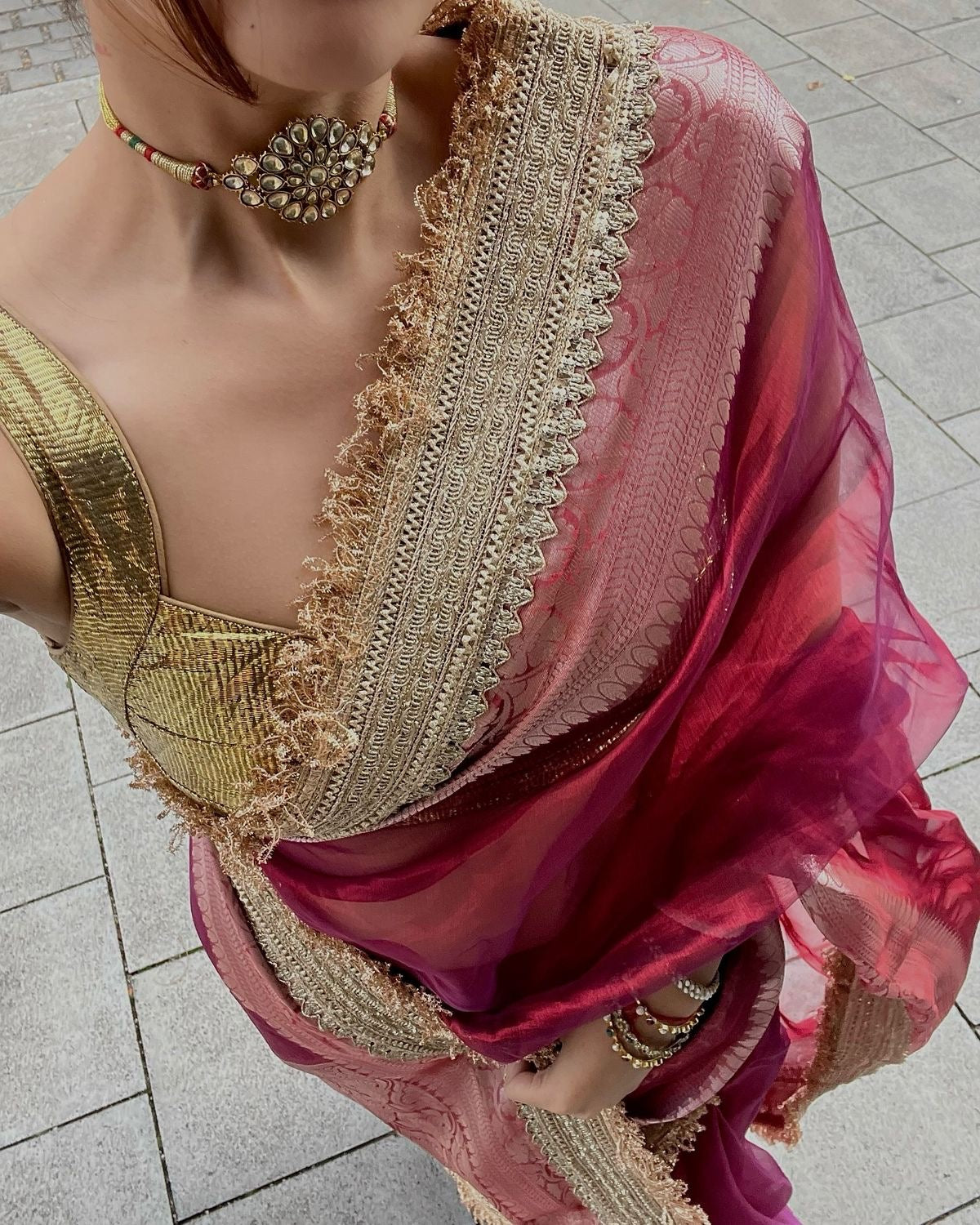 A delicate semi-tissue soft silk saree highlighted with an elegant gota zari work border. Ready to be crafted and dispatched within 4–5 days, perfect for your festive occasions.