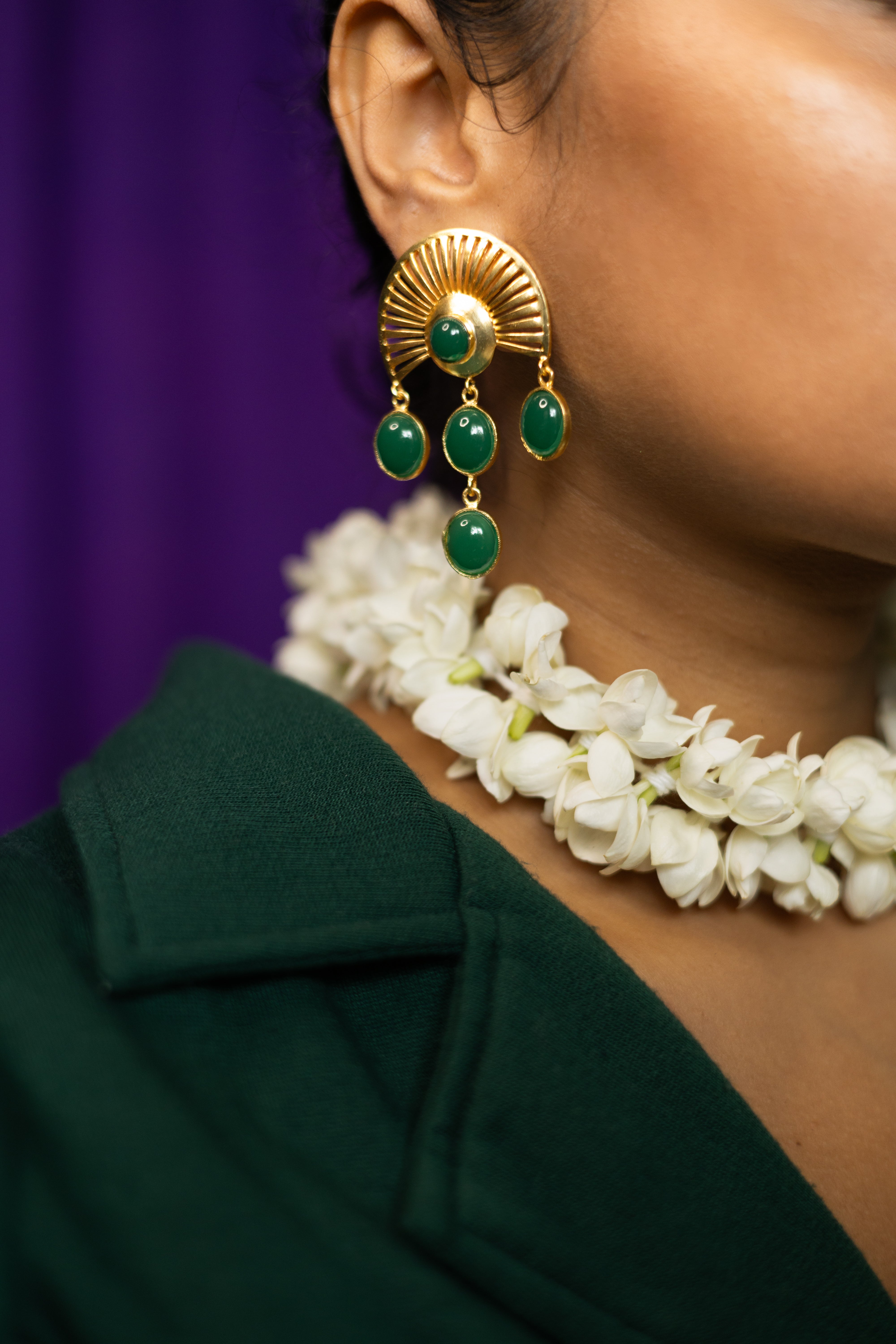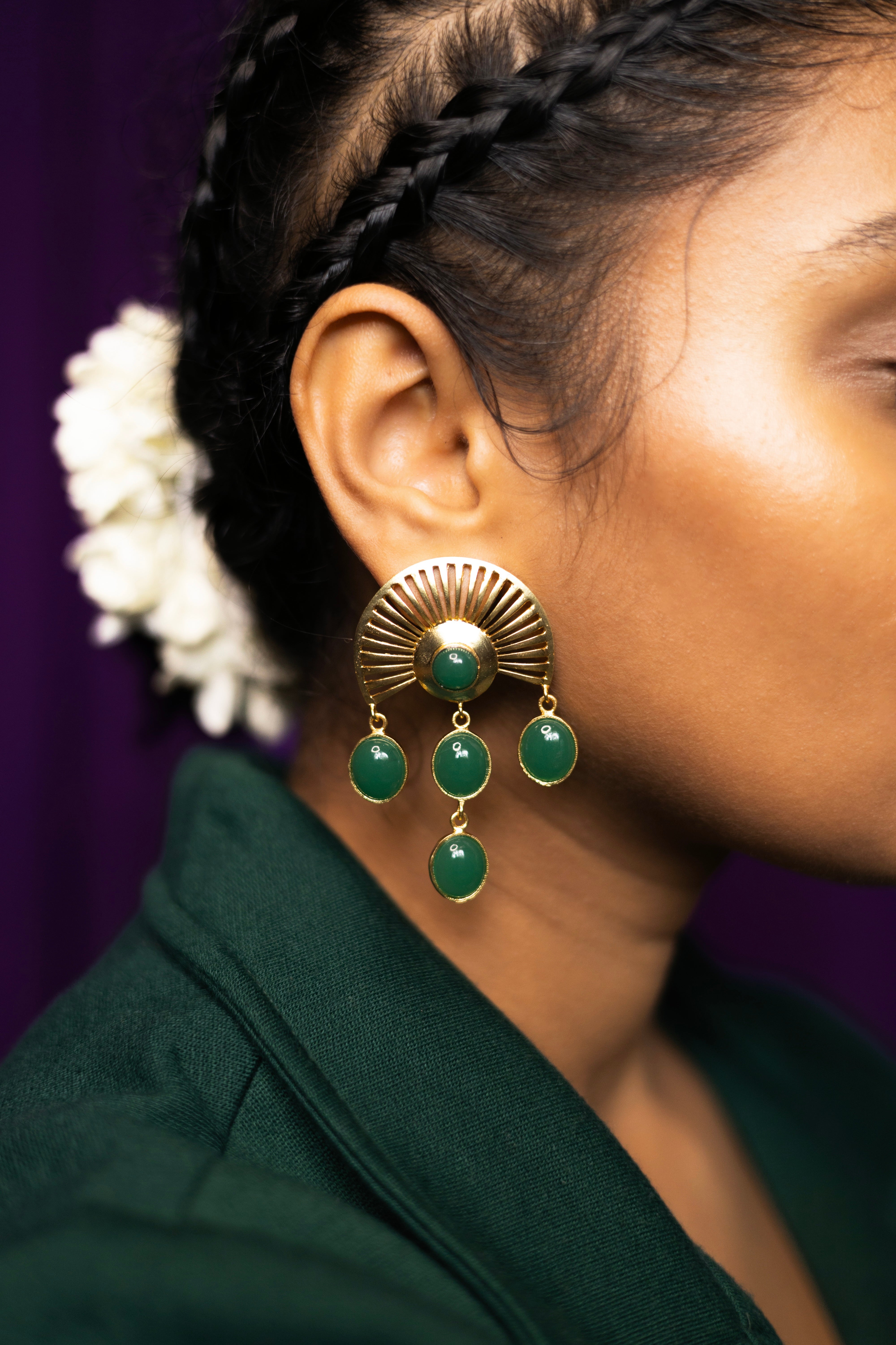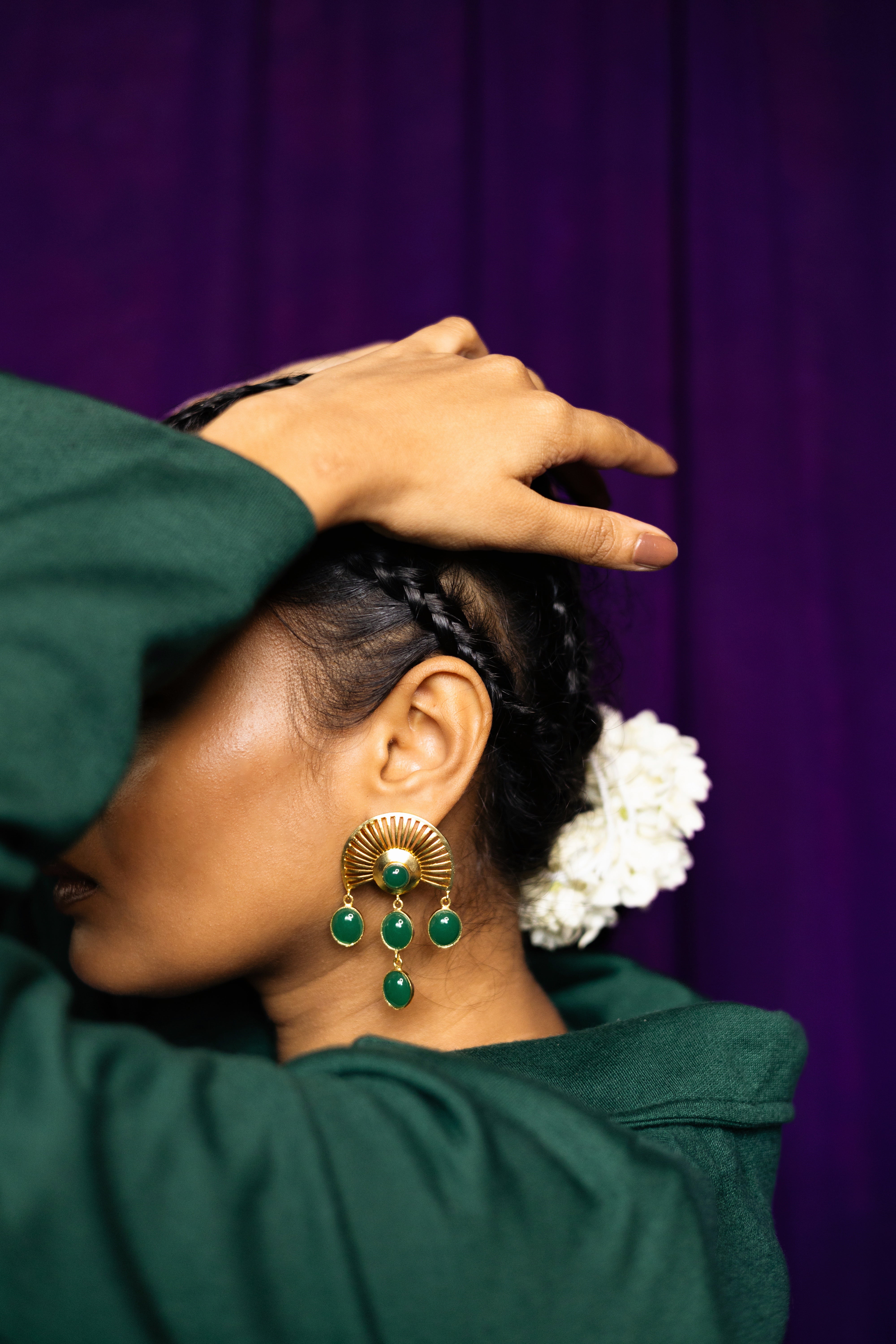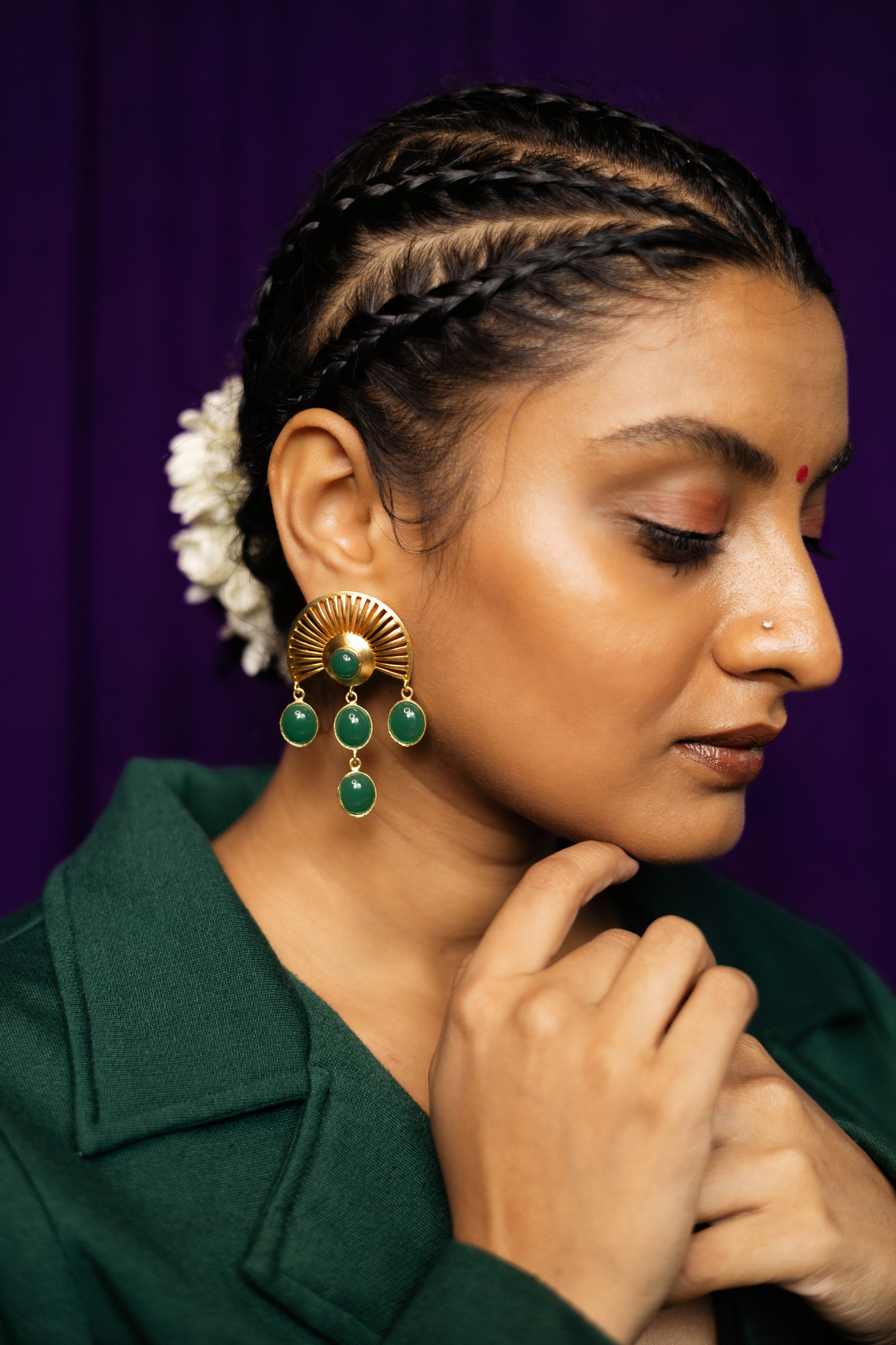 22k gold-plated danglers set with natural green stones, inspired by sunlight filtering through a quiet forest.