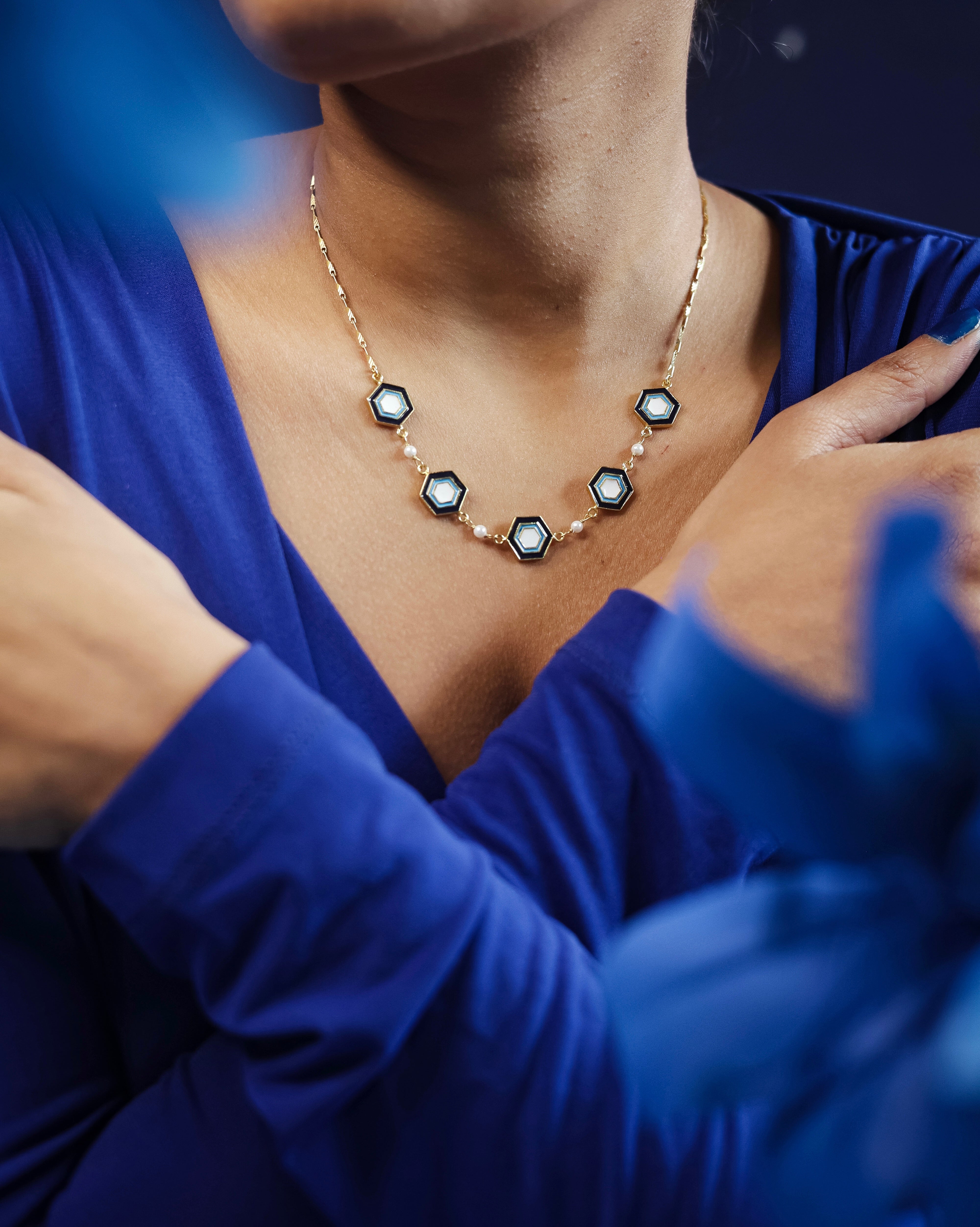 Each piece — from the necklace to the anklet — is meticulously painted by hand, merging the calm of geometry with the warmth of gold.