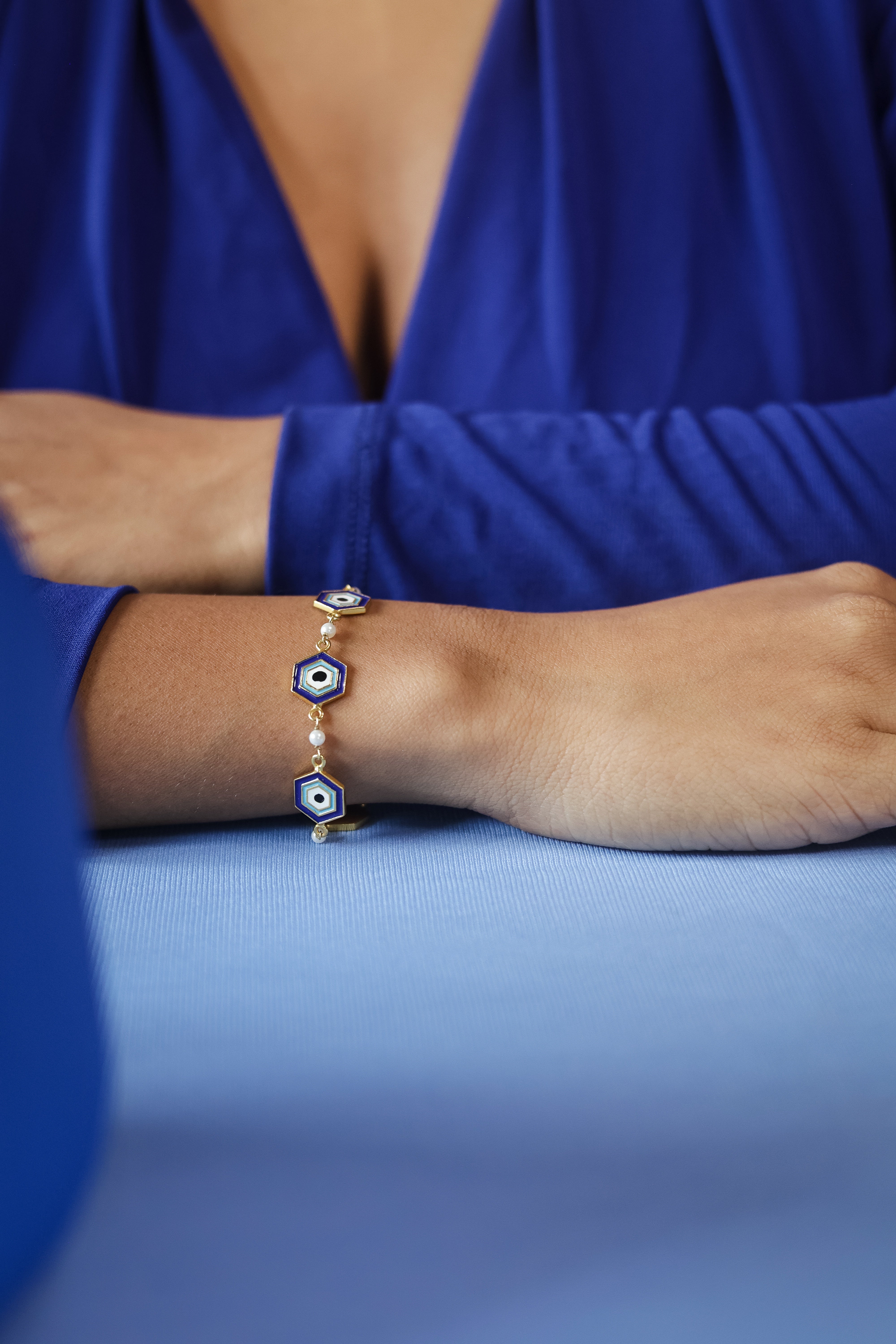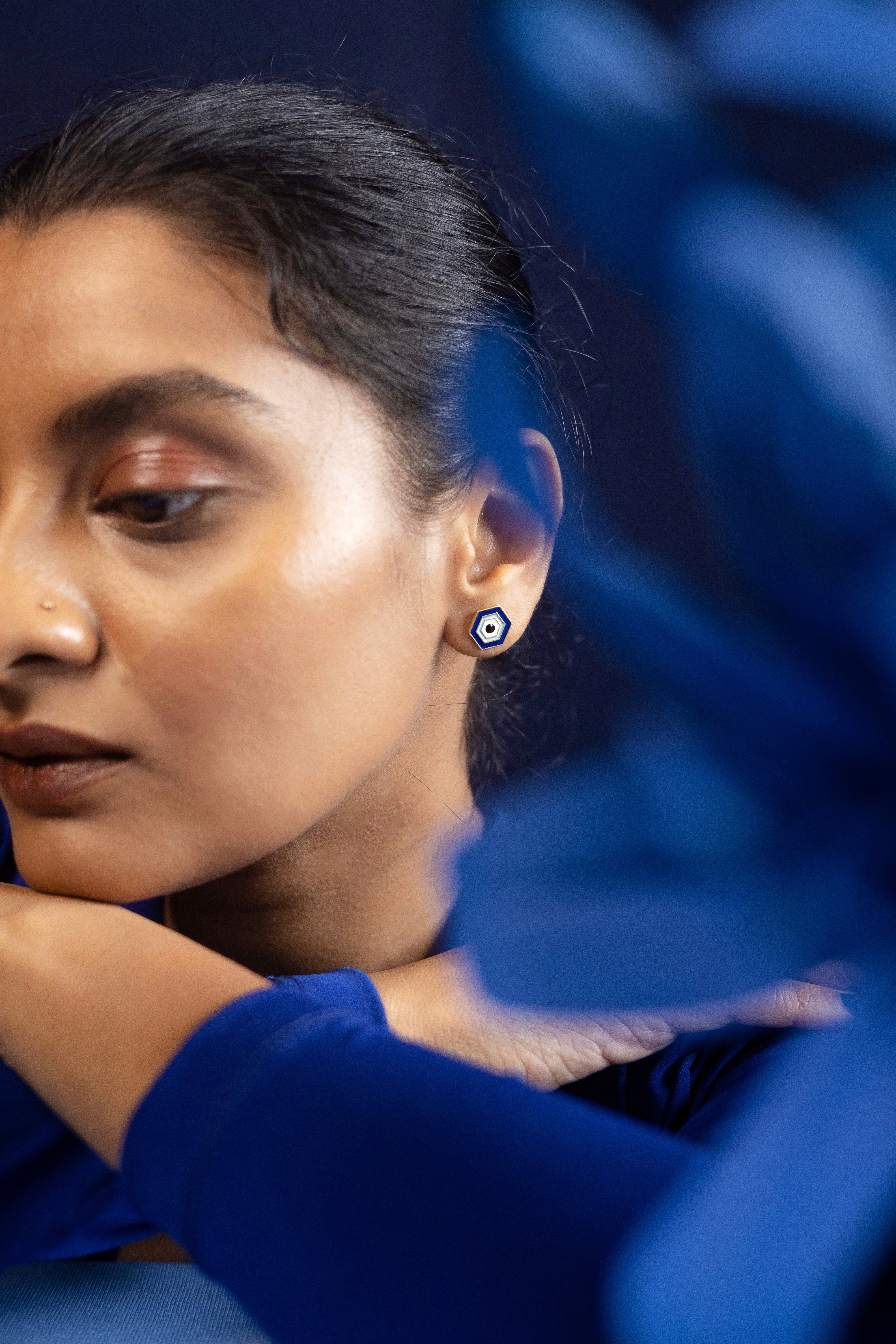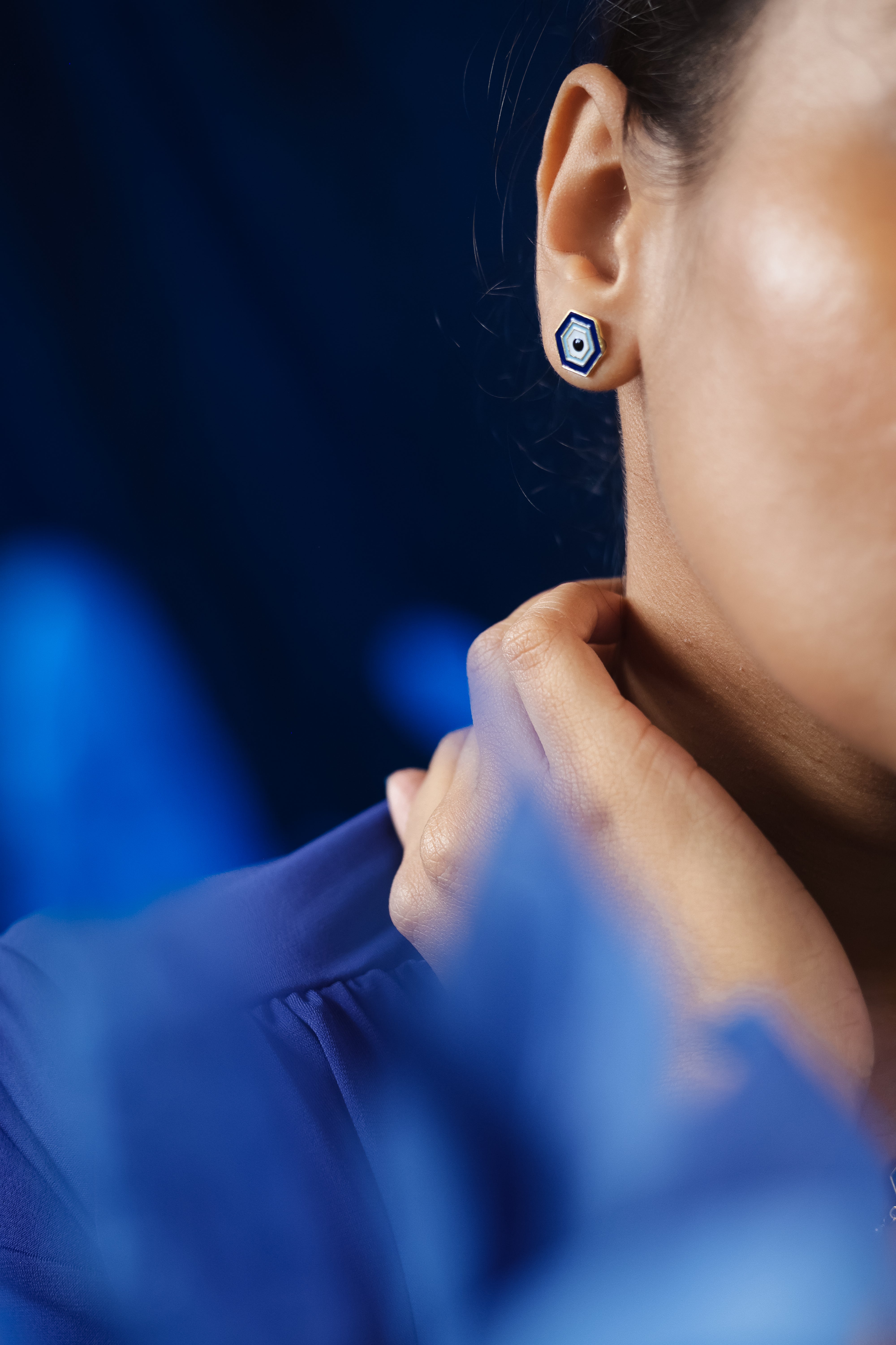 Inspired by the Evil Eye, this handcrafted 22k gold-plated set brings together geometry and protection through intricate enamel artistry.