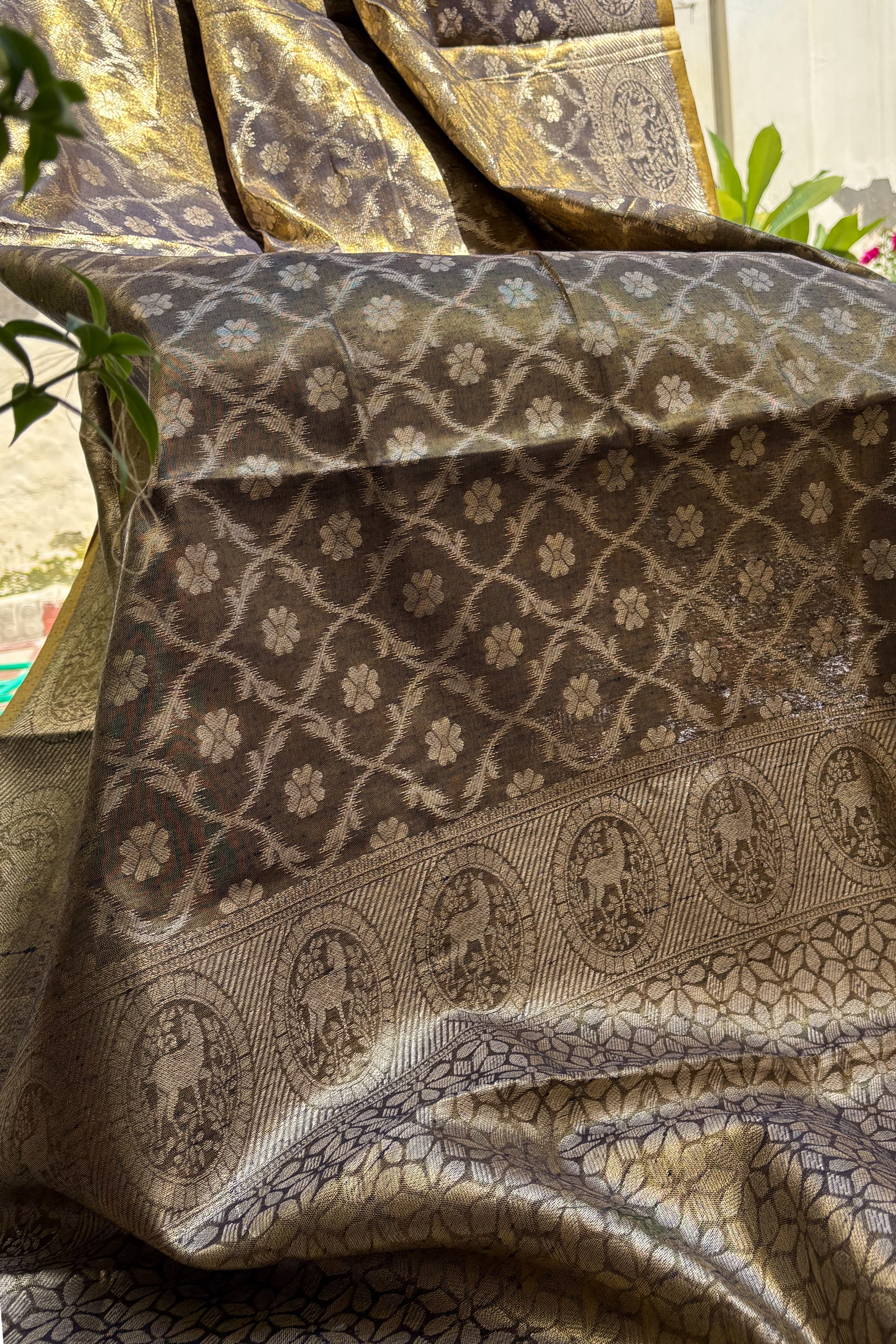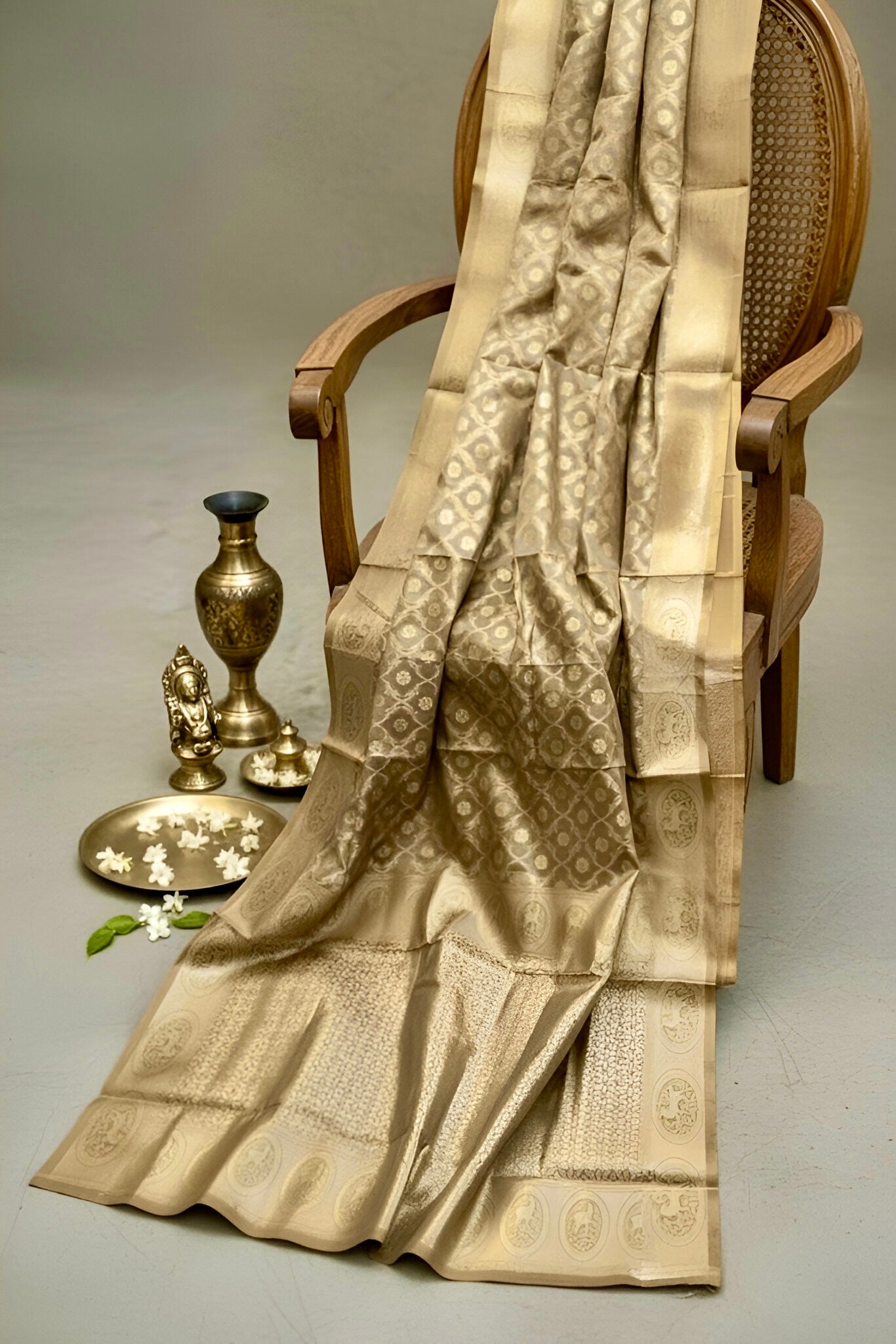 A delicate semi-tissue banarasi heavy silk saree highlighted with royal tissue zari work border and pallu of the saree, perfect for your festive occasions.