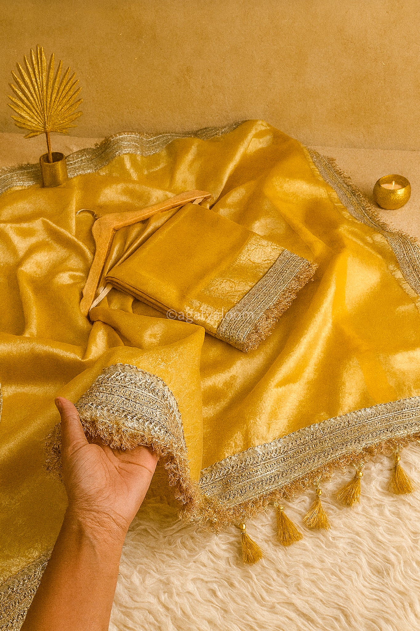 A delicate semi-tissue soft silk saree highlighted with an elegant gota zari work border. Ready to be crafted and dispatched within 4–5 days, perfect for your festive occasions.
