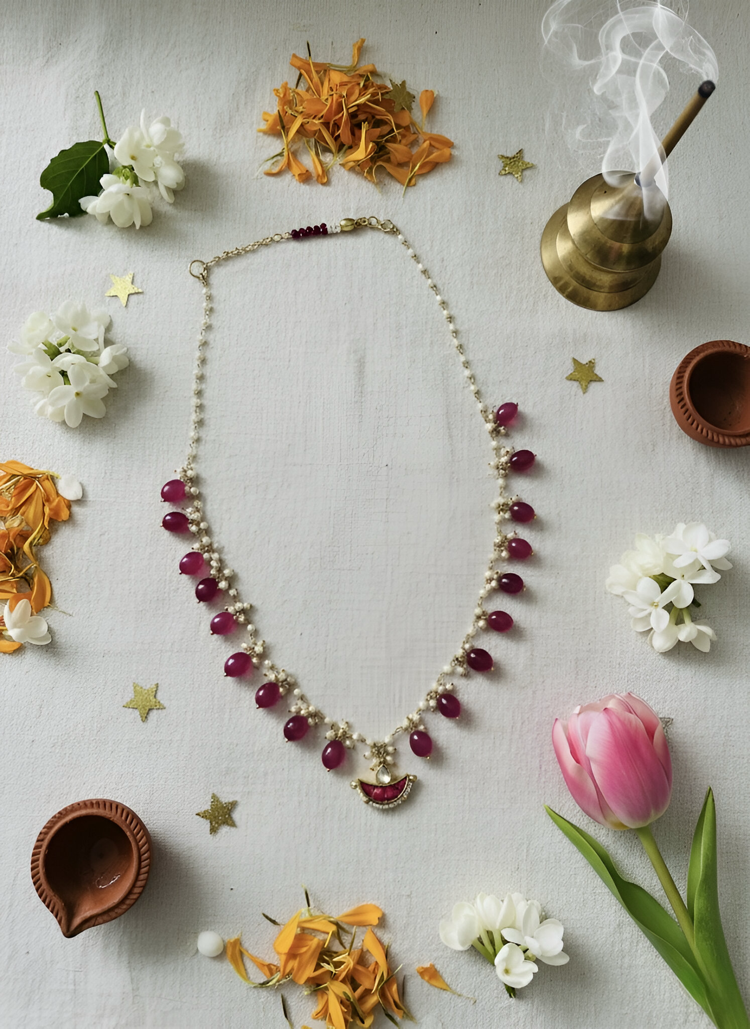 Minimalist necklace with vibrant red natural beads.