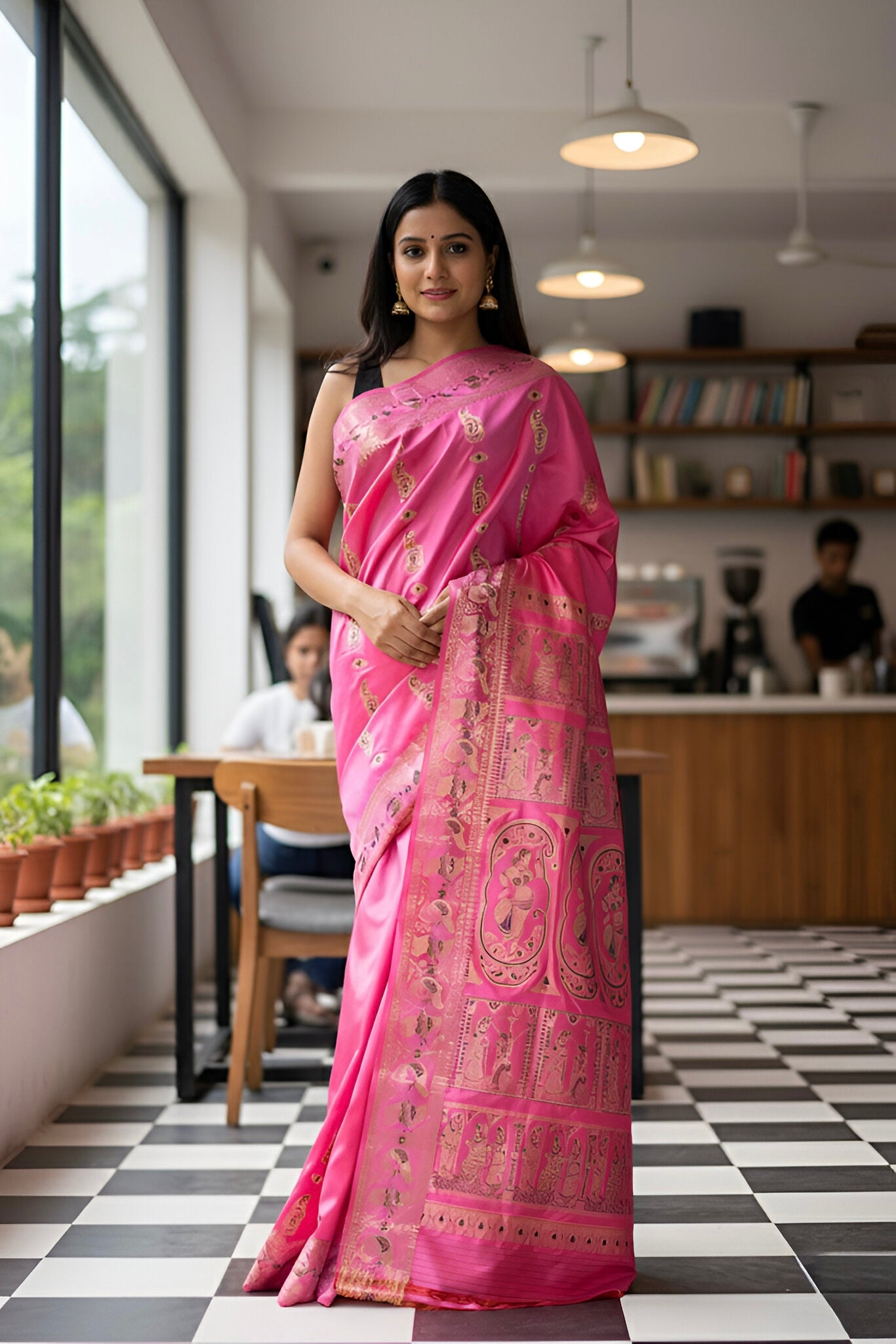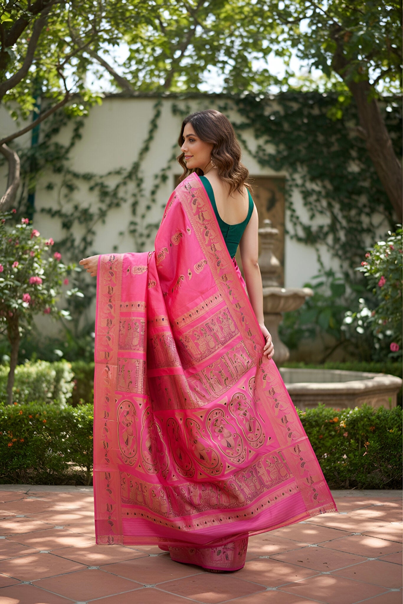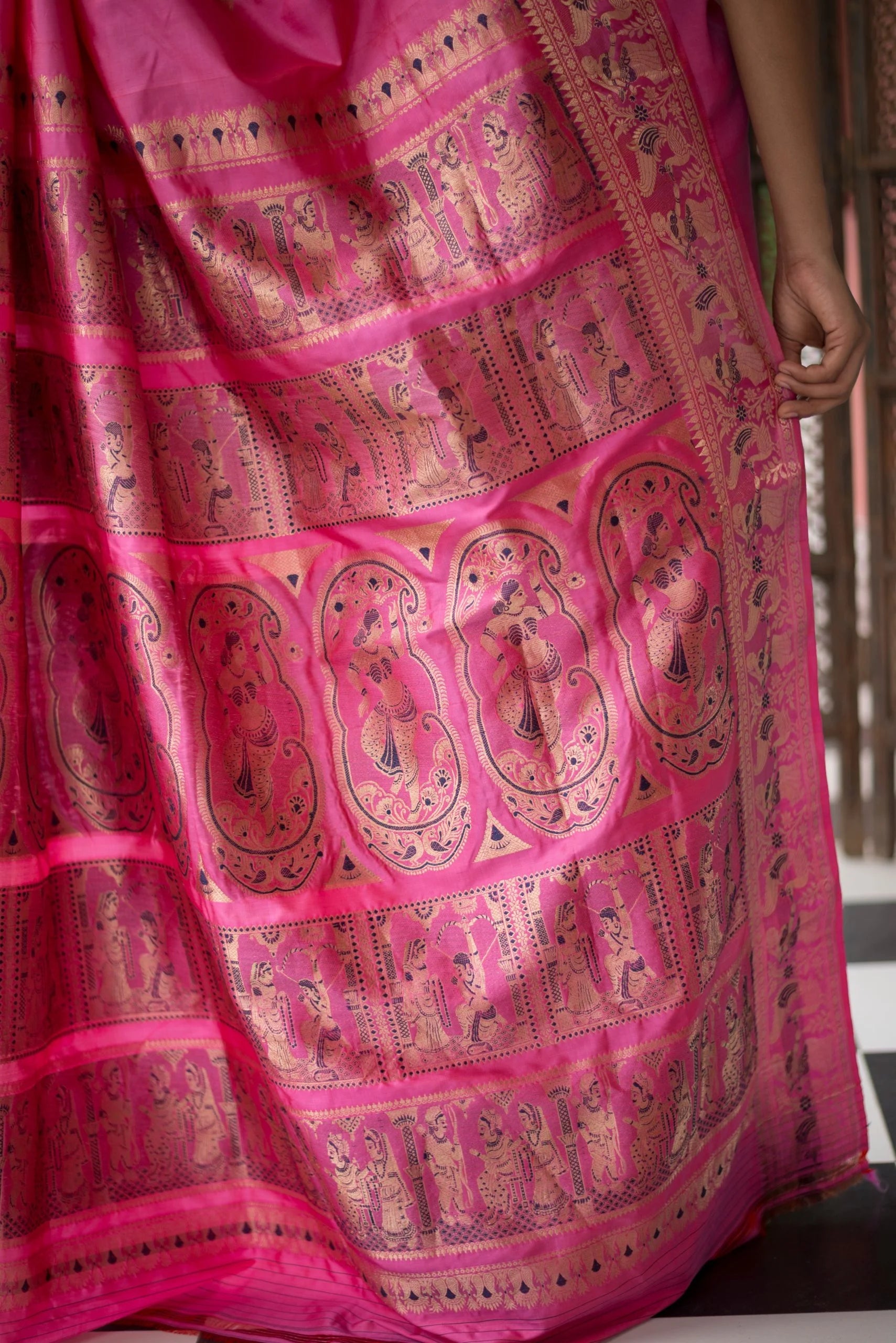 A certified silk mark tagged lightweight and handwoven on pure Bishnupuri silk saree. A pink and golden combination shornochari, this piece tells mythological tales in resham and zari, handcrafted by our master weavers who turn tradition into art. It’s a made to order saree.