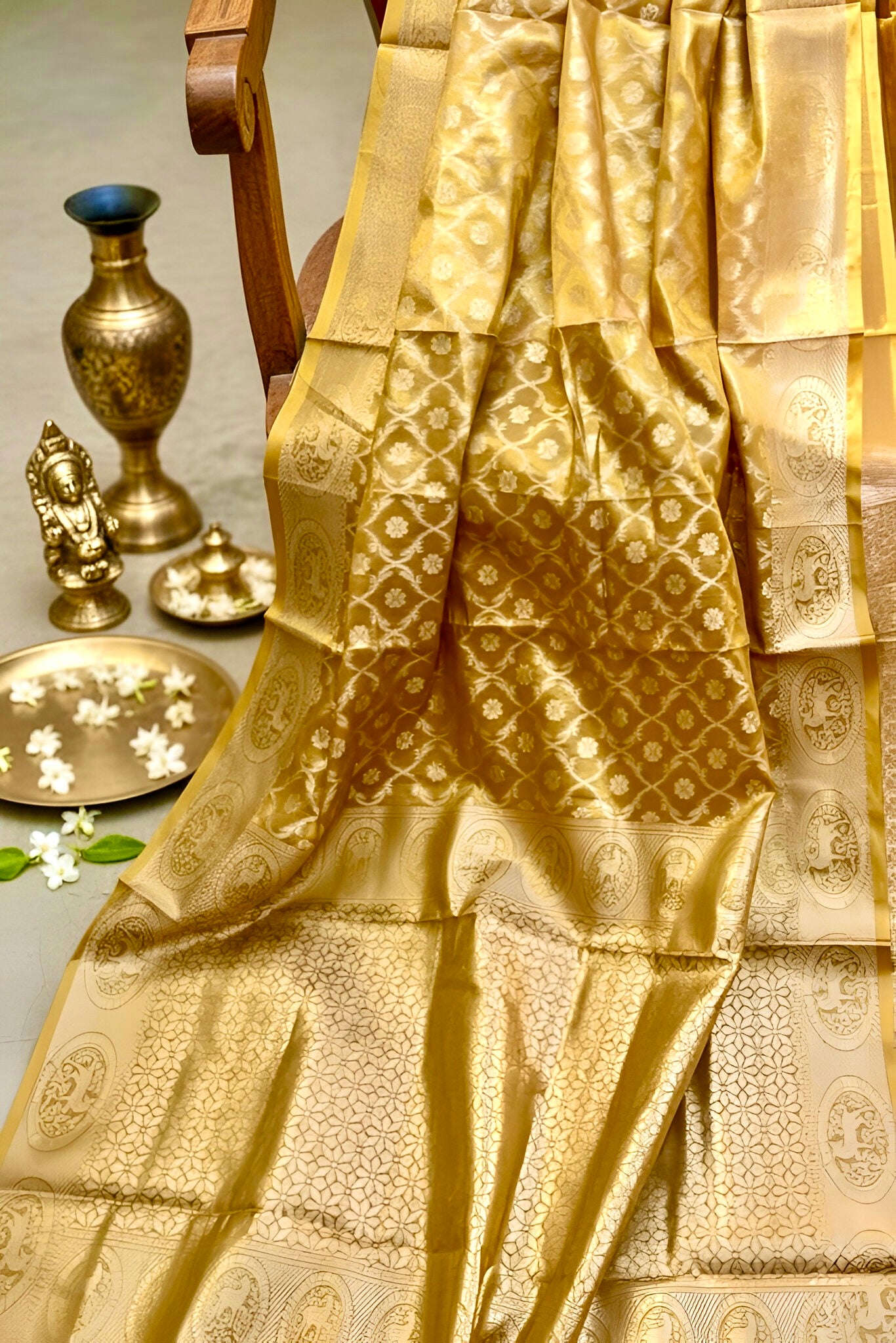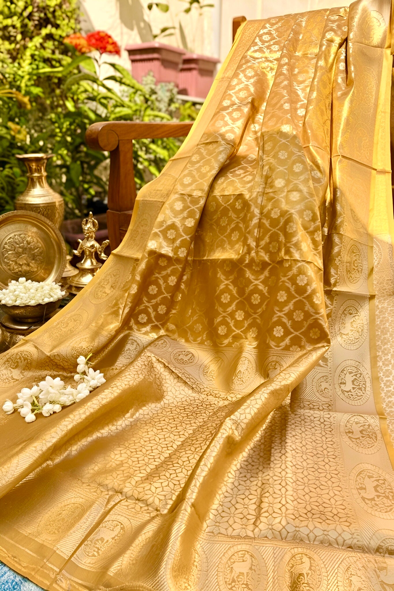 A delicate semi-tissue banarasi heavy silk saree highlighted with royal tissue zari work border and pallu of the saree, perfect for your festive occasions.