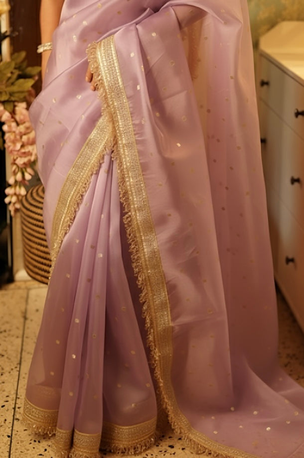 A delicate semi-tissue soft silk saree highlighted with an elegant gota zari work border. Ready to be crafted and dispatched within 4–5 days, perfect for your festive occasions.